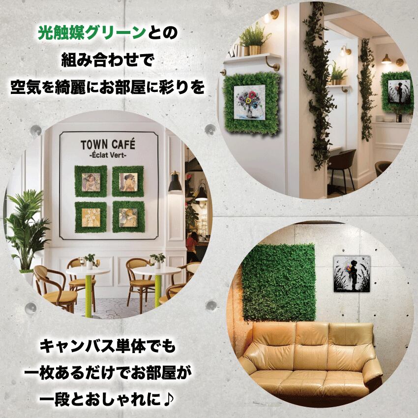 光触媒技術によってコーティングされたこのグリーンパネルは、インテリアに自然の息吹をもたらす優れたアイテムです。100cm×100cmのサイズは、インパクトがあり、一点設置するだけで空間の彩りと演出を表現することができ、自宅やオフィスの壁をグリーンで飾ることができます。デザインはシンプルながらも洗練されており、選べる3カラーからお好きな色をお選びいただけます。